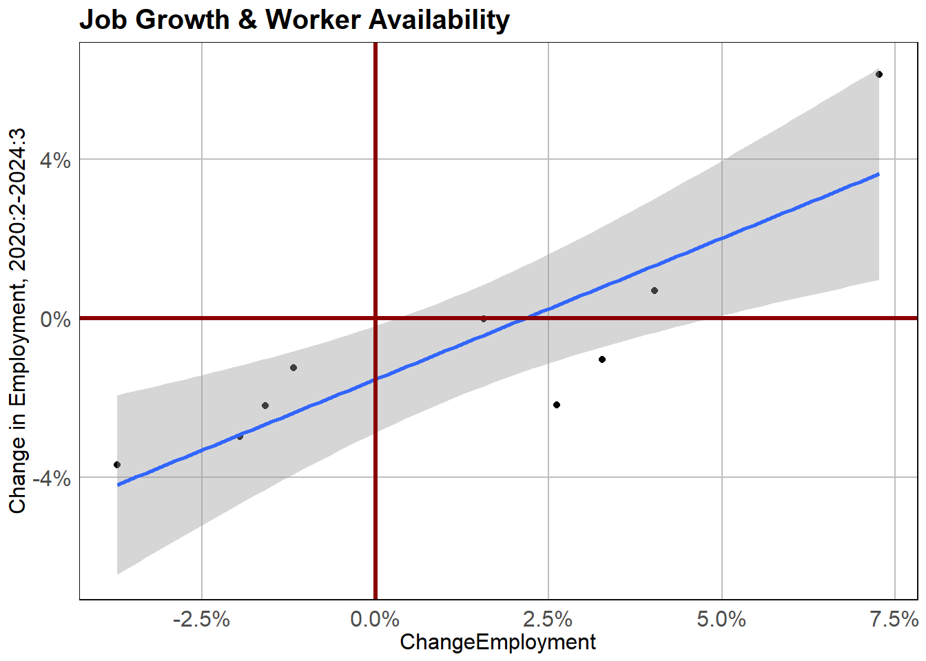 Another possible handicap is the supply of labor. The various CT metro areas do not appear to have the workers needed. Consider the following graph. It displays the relationship between employment growth and the availability of workers. It shows a positive relationship confirming how the lack of workers is constraining job growth in all metros albeit differently.