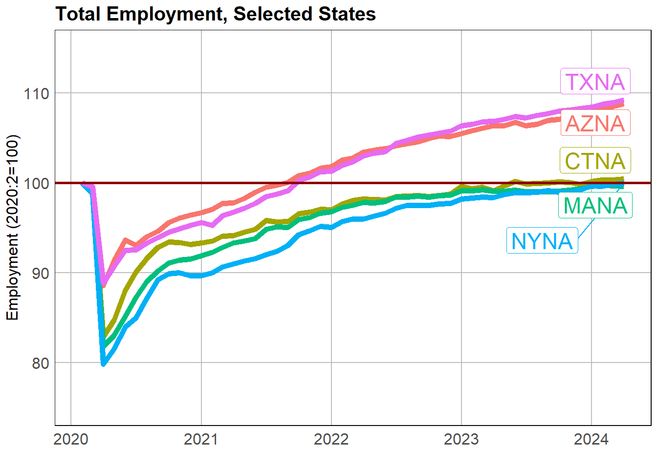 After 4 years the Covid-recovery is highly asymmetric across the states. Figure 1 shows the performance of Connecticut alongside its neighbors, New York and Massachussetts and two high-performing states: Texas and Arizona.
