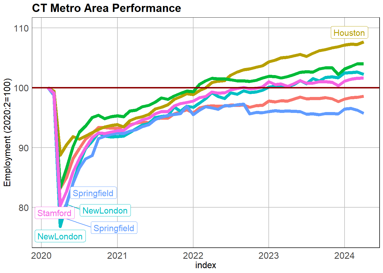 It is useful to examine our performance with other Metros. I added Houston to the mix; Figure 3 displays the employment performance of the set which includes Connecticut Metros and the Houston metro area.
