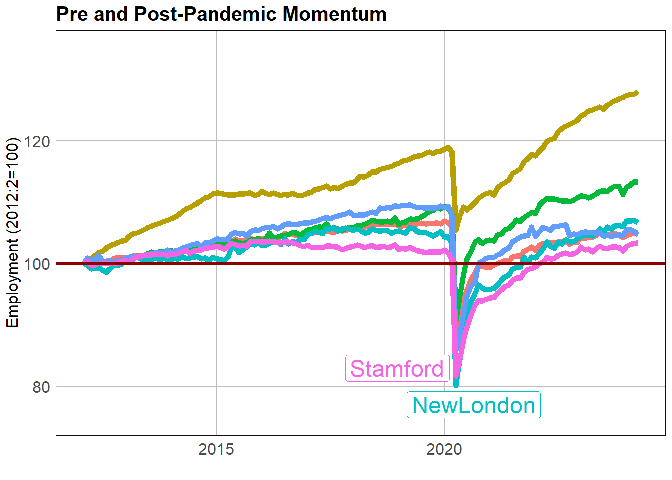 A similar recovery unevenness to the one displayed by the States can be found within Connecticut. Connecticut’s population hubs have only recently regained the level of jobs they had at the beginning of the Covid-period. Figure 2 shows relative Employment performance for the following Connecticut metro areas: